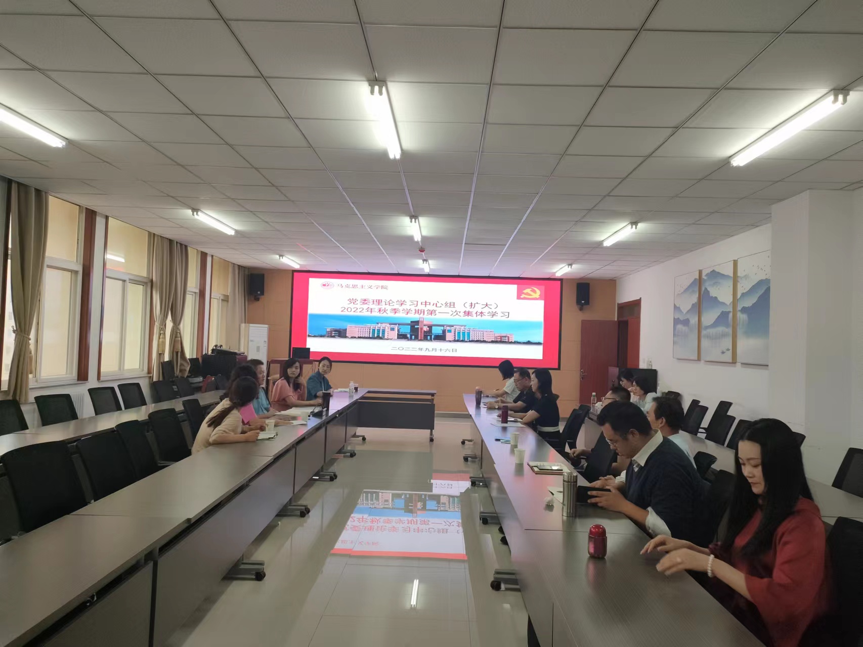 9月16日下午,马克思主义学院党委理论学习中心组(扩大)在长安校区诚意楼五层会议室举行2022年秋季学期第一次集体学习,学院班子成员、党委委员、党支部书记、教研室主任和科级干部参加集体学习,学院党委书记刘驰主持会议。