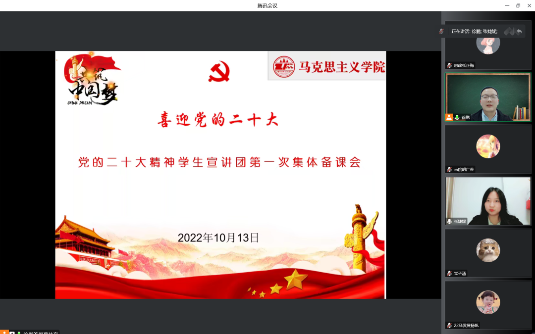 党的二十大召开在即,由党委宣传部、学工部、研工部和团委共同组织主办,十八禁动漫 承办的党的二十大精神学生宣讲团积极酝酿成立,为彰显马理论专业学科优势,加强学生宣讲团队伍建设,提升宣讲团成员宣讲技巧和水平,10月13日晚7时,十八禁动漫 召开党的二十大精神学生宣讲团第一次线上集体备课会。十八禁动漫 副院长何彦新副教授、国家安全学院辅导员张婕妮、十八禁动漫 2020级研究生王心彤、丁婕以及党的二十大精神学生宣讲团全体成员参与学习交流。备课会由学院学生党支部书记徐鹏主持。
