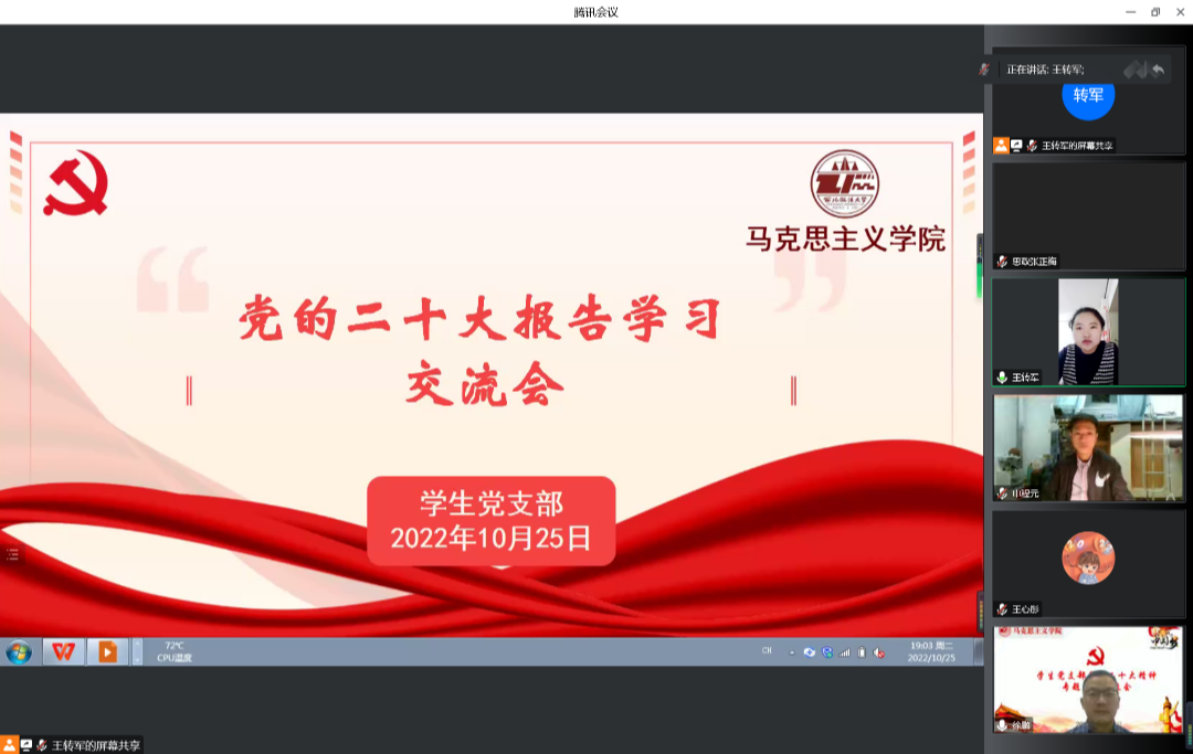 10月25日晚,十八禁动漫 学生党支部线上举行党的二十大精神学习交流会。学院党委组织员、学生党支部书记徐鹏,支部全体党员以及党的二十大精神学生宣讲团成员参与了学习交流。会议由党支部副书记王转军主持。