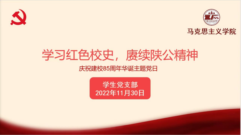 学生党支部线上召开“学习红色校史,赓续陕公精神”主题党日活动。学生支部全体党员、部分发展对象参加了此次活动。活动由2022级党员刘奕涵同志主持。