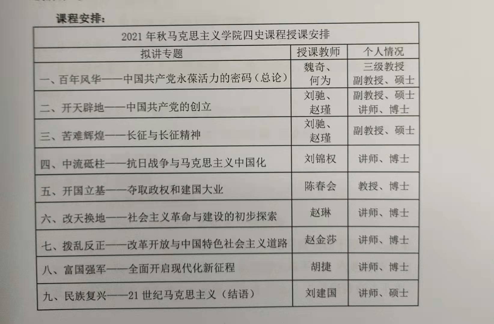 本学期开学伊始就开始与教务处对接协商,着手推进全校 “四史”课程的开设。学院领导对此高度重视,同时将其纳入党史学习教育中,作为学院的特色内容。专门成立了魏奇院长、刘驰书记、鲁阳副院长参与,以中国近现代史纲要教研室和马克思主义中国化教研室教师为主体的教学团队,研讨筹划课程开设的系列问题。考虑到学院教学安排实际并结合课程情况,决定将“四史”整合开设,定名为《“四史”理论专题》,采取专题教学方式,实行团队教学。由中国近现代史纲要教研室主任赵琳老师作为课程负责人具体准备材料,向教务处申报开设课程。目前,课程申报表、说明、大纲及教案等材料已经全部提交教务处,拟作为面向全校本科生的大思政类限定选修课申报于下半年正式开设。
