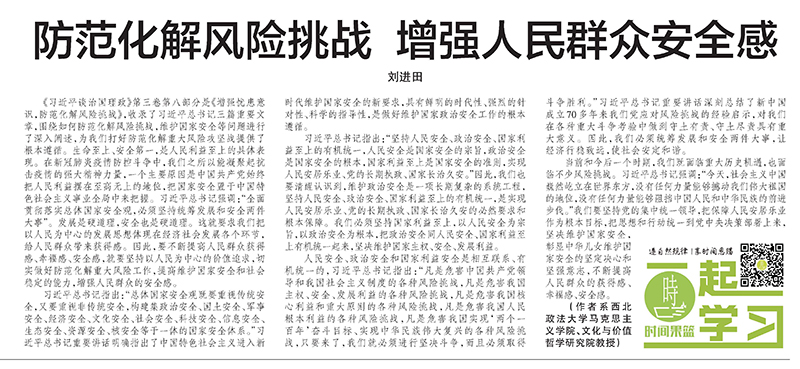 人民安全、政治安全和国家利益安全是相互联系、有机统一的,习近平总书记指出:“凡是危害中国共产党领导和我国社会主义制度的各种风险挑战,凡是危害我国主权、安全、发展利益的各种风险挑战,凡是危害我国核心利益和重大原则的各种风险挑战,凡是危害我国人民根本利益的各种风险挑战,凡是危害我国实现‘两个一百年’奋斗目标、实现中华民族伟大复兴的各种风险挑战,只要来了,我们就必须进行坚决斗争,而且必须取得斗争胜利。”习近平总书记重要讲话深刻总结了新中国成立70多年来我们党应对风险挑战的经验启示,对我们在各种重大斗争考验中做到守土有责、守土尽责具有重大意义。因此,我们必须统筹发展和安全两件大事,让经济行稳致远,使社会安定和谐。