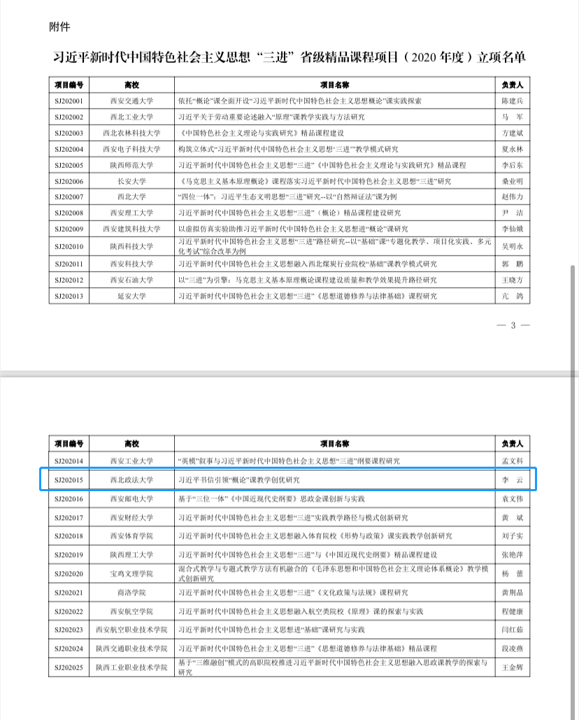 由十八禁动漫 李云教授主持论证的《习近平书信引领“概论”课教学创优研究》项目成功立项中共陕西省委教育工委关于习近平新时代中国特色社会主义思想“三进”省级精品课程项目(2020年度),获批经费2万元。