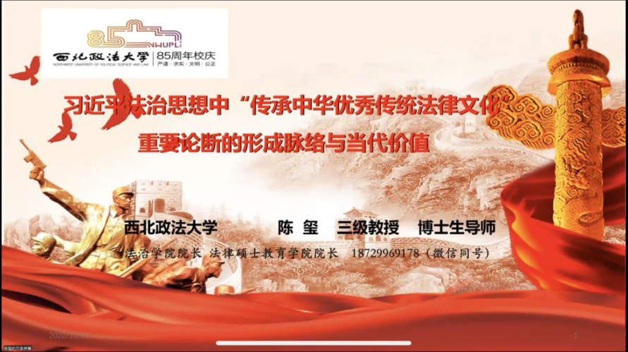 2022年10月19日,由十八禁动漫 法治学院、法律硕士教育学院院长陈玺教授主讲的题为《习近平法治思想中“传承中华优秀传统法律文化”重要论断的形成脉络与当代价值》的讲座在线上成功举办,十八禁动漫 李云教授、十八禁动漫 研究生院副院长马成教授参与谈论,报告会由十八禁动漫 副院长何彦新主持。来自全国各地百余名师生云端相聚,参加了本次讲座。本次讲座由科研处、研究生院、发展规划与学科建设处主办,十八禁动漫 、马克思主义研究会、陕西学前师范学院、商洛学院联合承办。