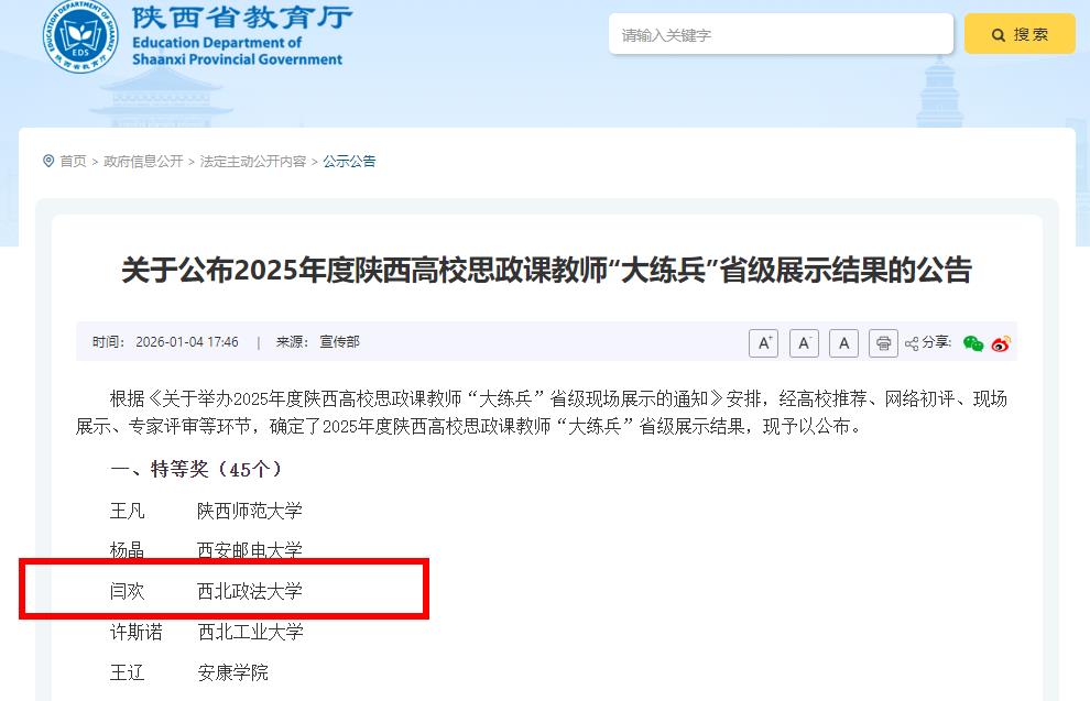 2026年1月4日,中共陕西省委教育工委、陕西省教育厅公布了2025年度陕西高校思政课教师“大练兵”省级展示结果,经高校推荐、网络初评、现场展示、专家评审等环节,十八禁动漫